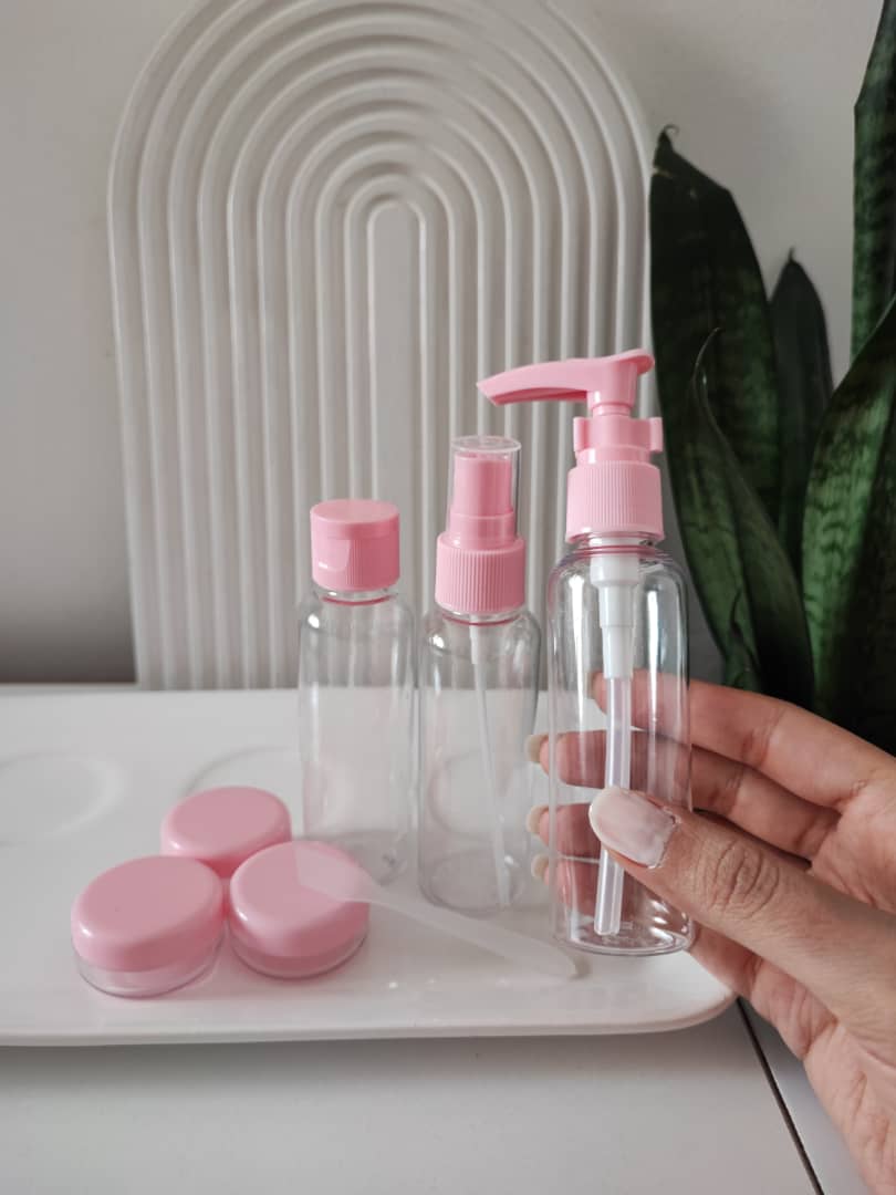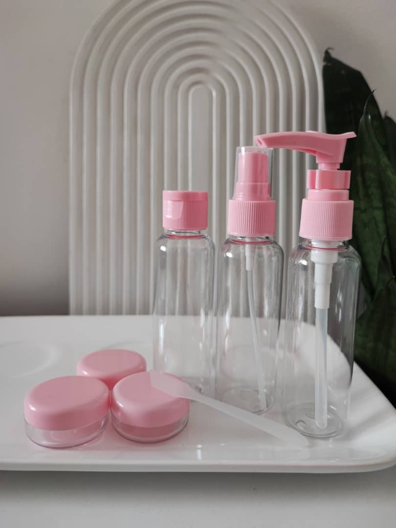 پک بطری مسافرتی 6 تیکه با کیفیت مناسب برای ریختن میسلار واتر، تونر، شامپو، ضدآفتاب، لوسیون، شوینده و … شامل ۲ عدد بطری، ۱ عدد اسپری،3 عدد کاسه کوچک دارای جنس با دوام